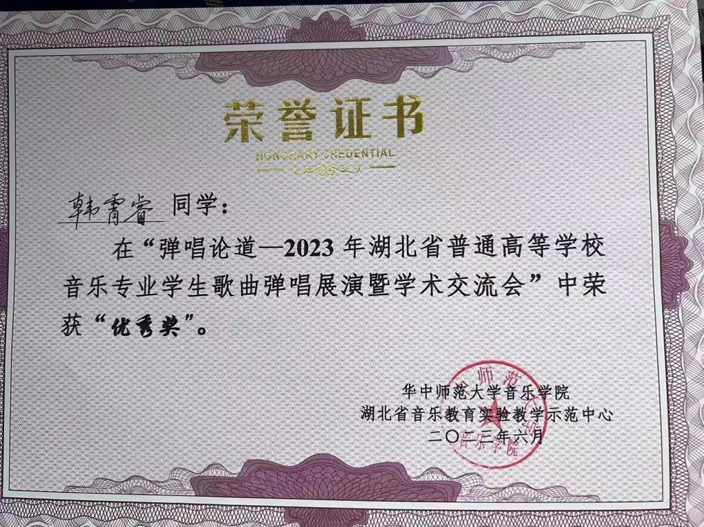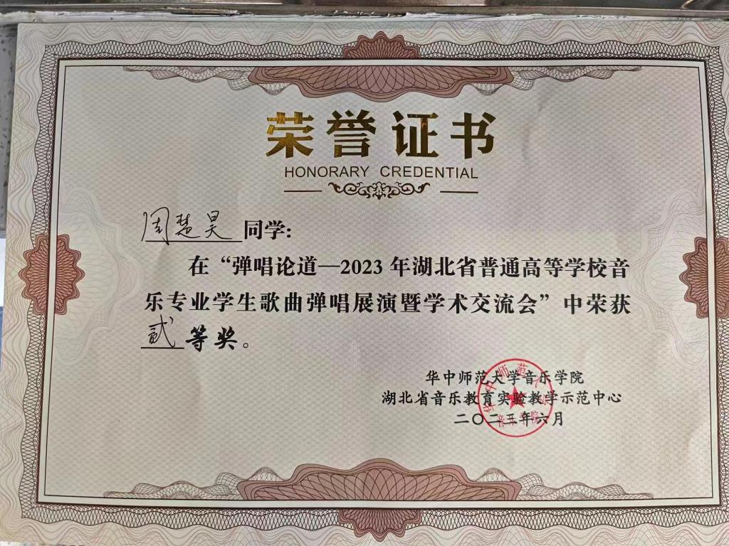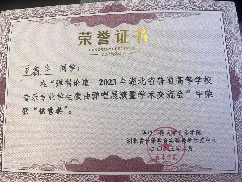 (通讯员 王健芸)在夏花盛开的六月,第一届湖北省高等院校音乐专业学生“歌曲弹唱展演暨学术交流会”在桂子山召开。歌曲弹唱是音乐教育中一项重要的教学内容,也是中小学音乐教师的一项必备技能。此次活动由华中师范大学主办,有13所省内高校近60名选手参加,竞争激烈,我院音乐学系20级周楚昊同学荣获二等奖,罗鑫宇、韩霄睿同学获得优秀奖。本次活动