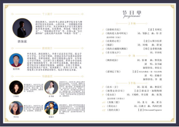 整场音乐会共12首作品,分中国近现代民族声乐的经典作品和外国艺术歌曲两个部分其风格迥异,民族风味浓郁,每首作品的旋律都令人回味难忘。