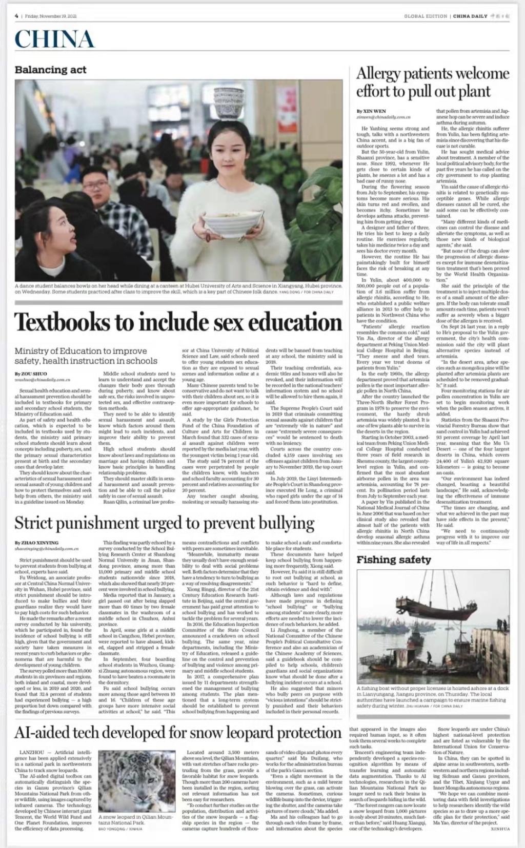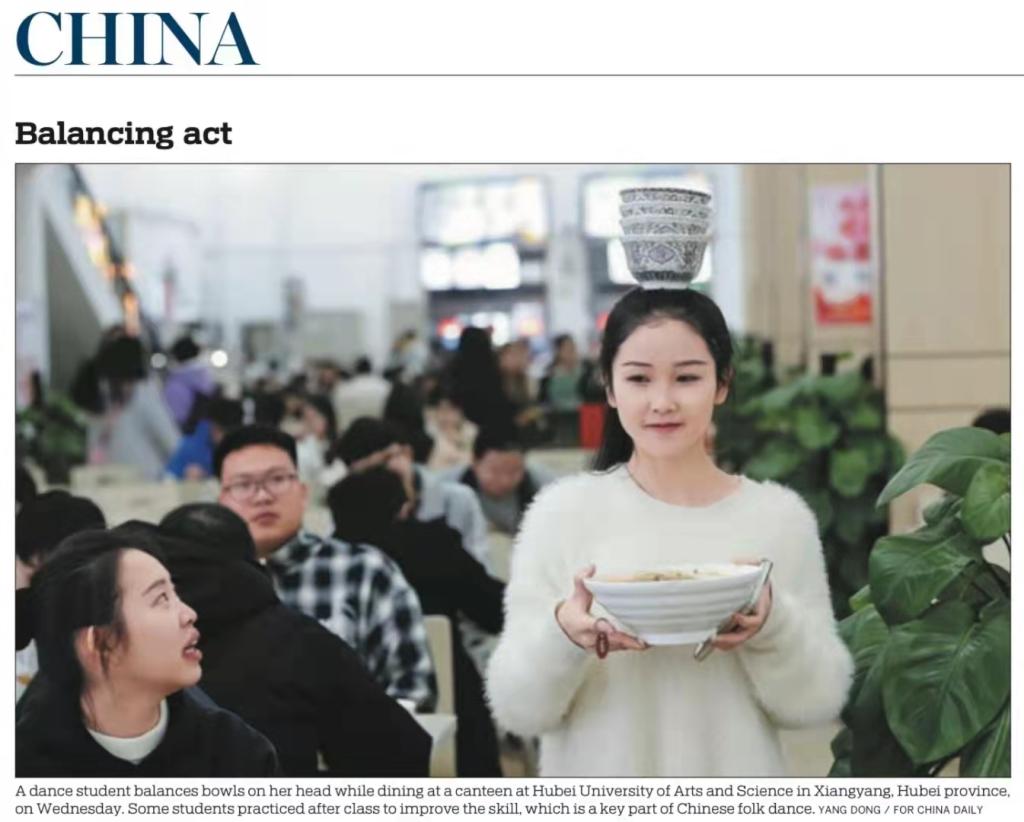 在湖北省襄阳市伟德国际victor1946,一名舞蹈系学生在食堂就餐时将碗顶在头上练习平衡。许多舞蹈生常在课后练习,以提升平衡能力,这是中国民族舞蹈的重要技巧。杨东/《中国日报》报道