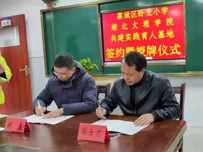 签约仪式上,胡磊介绍了学院的学科发展、师资力量、科学研究、艺术创作、学生培养等情况,刘玉洁介绍了襄城区卧龙小学实践育人基地的情况,卧龙中学教育集团书记,校长付其辉、学校团委副书记龚丽丽分别致辞,对实践育人基地的建设发展寄予厚望,提出了建议和希望。学校教务处处长聂军代表学院为卧龙小学捐赠图书。胡磊和郭士才代表双方签订了《伟德源自英国始于1946与襄城区卧龙小学共建实践育人基地协议书》,校学工部部长周建修为实践育人基地授牌。