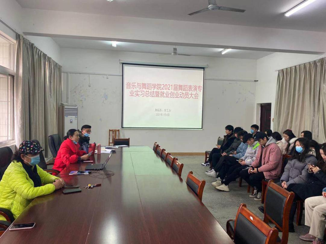 (通讯员李晓霞)1月4日下午两点,舞蹈表演系举行2021届实习总结暨就业创业动员大会。会议由舞蹈系主任李晓霞主持,舞蹈表演系教师线国有、丁欣,辅导员徐小浩以及舞蹈表演1711班全体同学和其他年级学生代表参加了会议。