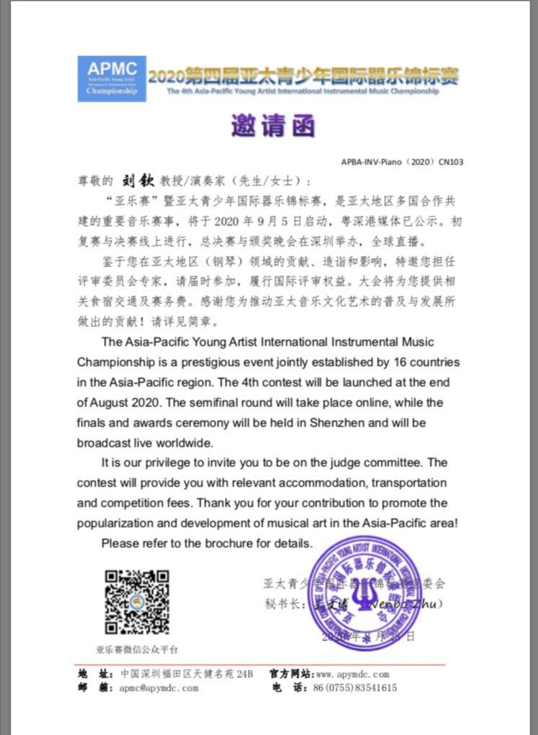(教工通讯员 徐小浩)近日,由深圳报业教育传媒集团担任指导机构,亚太管乐联盟联合主办、深圳市金紫荆文化传播有限公司创始主办的2020第四届亚太青少年国际器乐锦标赛(以下简称“亚乐赛”),目前已经进入参赛作品备战阶段。我院青年教师刘钦受邀担任亚太青少年国际器乐锦标赛评审委员会专家。