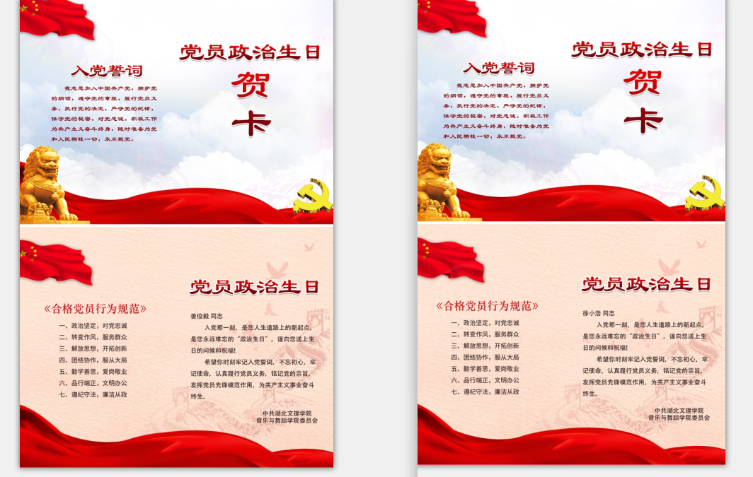 (学生支部和教工三个支部分别精心设计了新党员入党宣誓环节和发放政治生日贺卡)