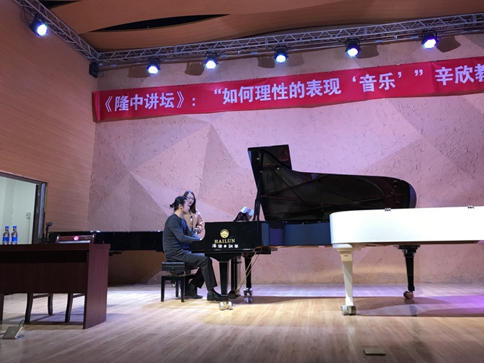 辛欣教授从音乐的结构、音色与音调、乐句处理和了解乐器四个方面阐释了调性、和声/和音(踏板)、节拍/律动感的内涵,指导演奏者准确把握音高、音量、速度和节奏时值,以达到完美音色的呈现。他还现场示范演奏,指导学生了解钢琴的结构、键盘和踏板的控制,认识乐器的缺陷,引导学生较好地把握乐句处理中的起伏、连贯性及高点、长音的处理。