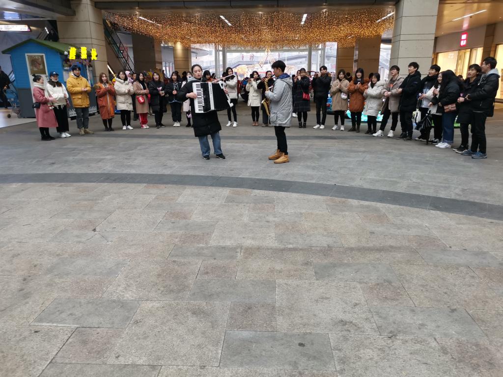 又恰逢周末,不少正在广场散步、游玩的老人、小孩、青年人,以及广场的工作人员情不自禁一起哼唱起了“学习雷锋好榜样”,歌声与掌声此起彼伏。看完我们表演的“快闪”歌舞,深受感染的观众们,强烈要求再演一遍。