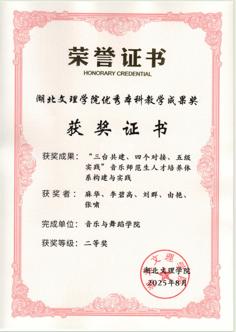 该成果紧扣音乐师范生培养核心需求,创新打造“三台共建、四个对接、五级实践”的特色人才培养体系,在教学模式创新、实践环节强化、人才质量提升等方面成效显著,为我院乃至学校音乐教育专业的人才培养工作提供了可复制、可推广的宝贵经验,是我院在本科教学改革与实践领域深耕细作的又一重大突破,充分彰显了我院教师团队在教育教学研究与创新方面的强劲实力,为推动学校本科教育教学高质量发展贡献了重要力量。