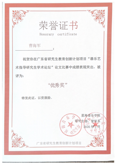 2026年3月27日,广东省研究生教育创新计划项目——“器乐艺术指导研究生学术论坛”在广州圆满落下帷幕。作为论坛的重要组成部分,论文比赛也同期顺利结束。本次比赛由星海音乐学院研究生部、艺术实践服务中心、管弦系联合主办。伟德国际victor1946音乐与舞蹈学院 声乐老师曹海军代表学院参加本次论文评选,在全国范围内多所院校师生的激烈竞争下。经专家盲审初评、复评,依据原创性、学术性、实践性等标准严格遴选,最终曹海军老师荣获优秀奖。
