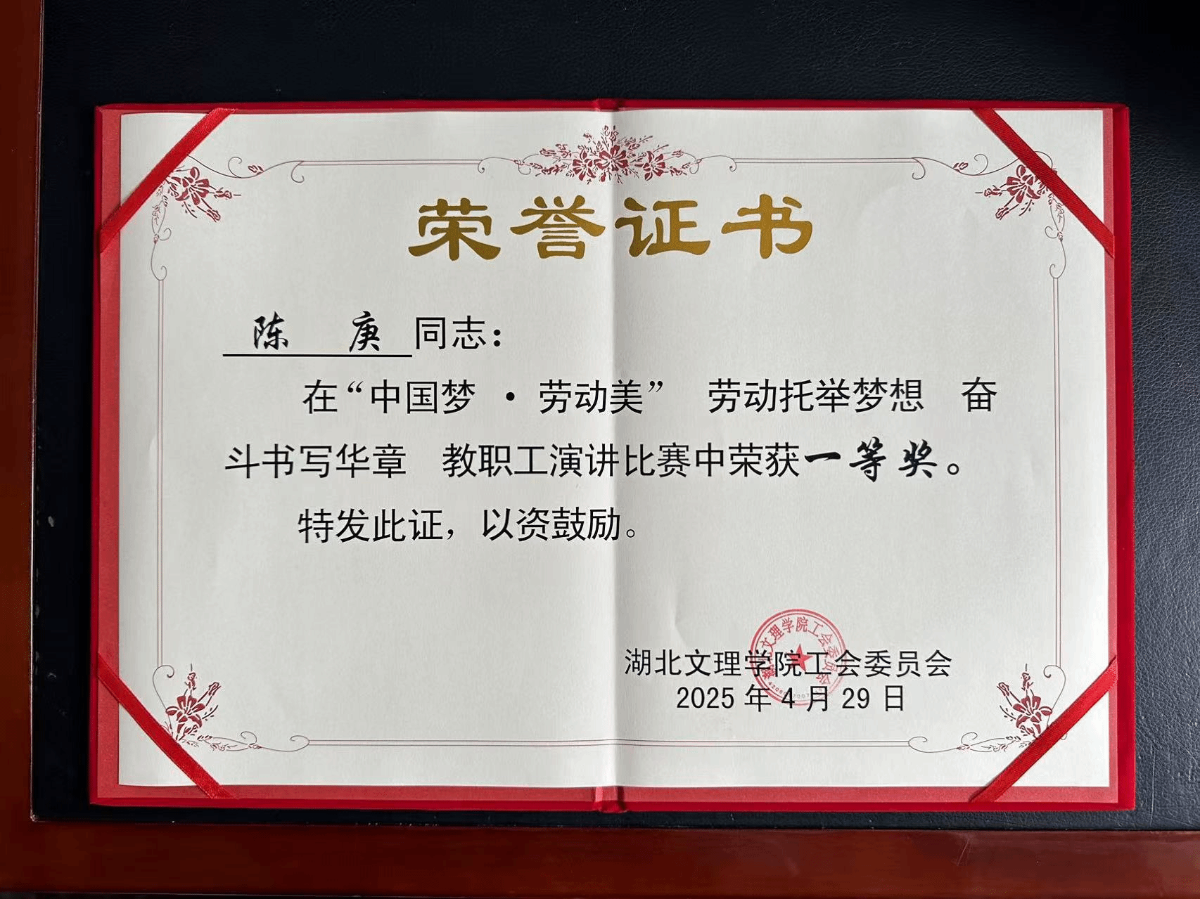 (通讯员 陈庚)2025 年 4 月 29 日,学校 “中国梦・劳动美” 教职工演讲比赛在文学传媒学院演播厅圆满落幕。我院陈庚老师以《支教心不怠 奋斗传大爱》为题的精彩演讲,凭借深刻的主题表达、生动的案例演绎和精湛的舞台表现力,从全校 19名参赛教师中脱颖而出,荣获一等奖。