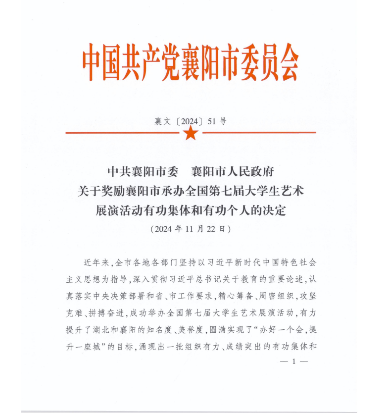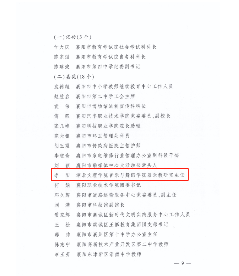 (通讯员 张博谦)近期我院器乐教研室主任李阳被襄阳市委市政府评为襄阳市承办第七届大学生艺术展演活动有功个人。据悉2023年9月至2024年6月,李阳作为在襄高校专业骨干教师被抽调至全国第七届大学生艺术展演活动筹委,参与筹办工作。负责统筹、策划“大艺展”中的器乐类展演项目和开、闭幕式等一系列重要展演活动的筹备工作。