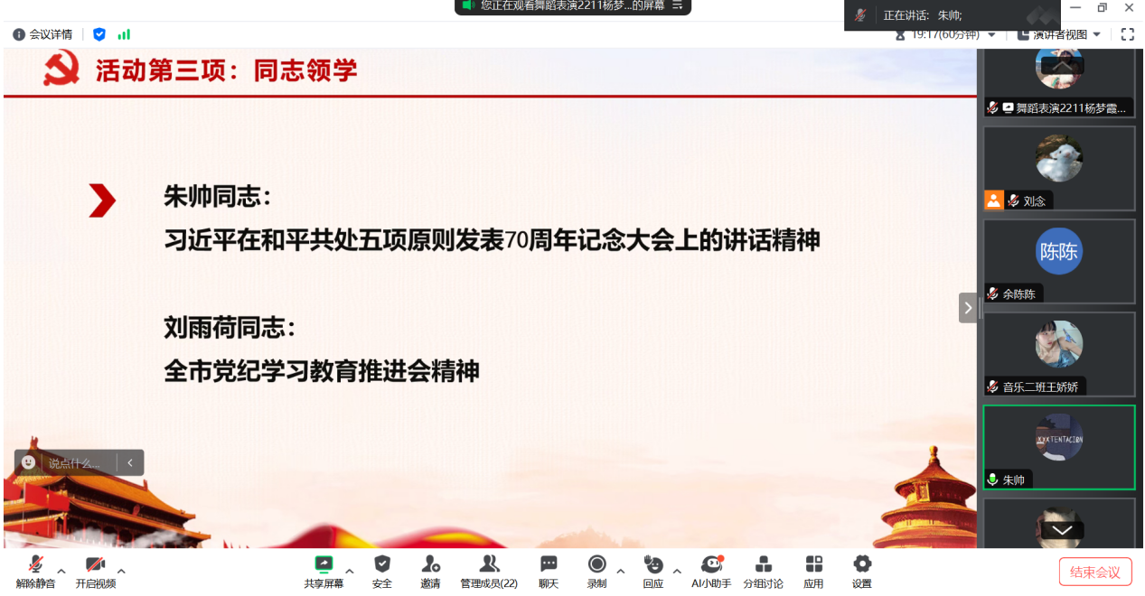 随后,朱帅同志和刘雨荷同志分别带领党员们学习了“习近平在和平共处五项原则发表70周年记念大会上的讲话精神”和“全市党纪学习教育推进会精神”重要文件。