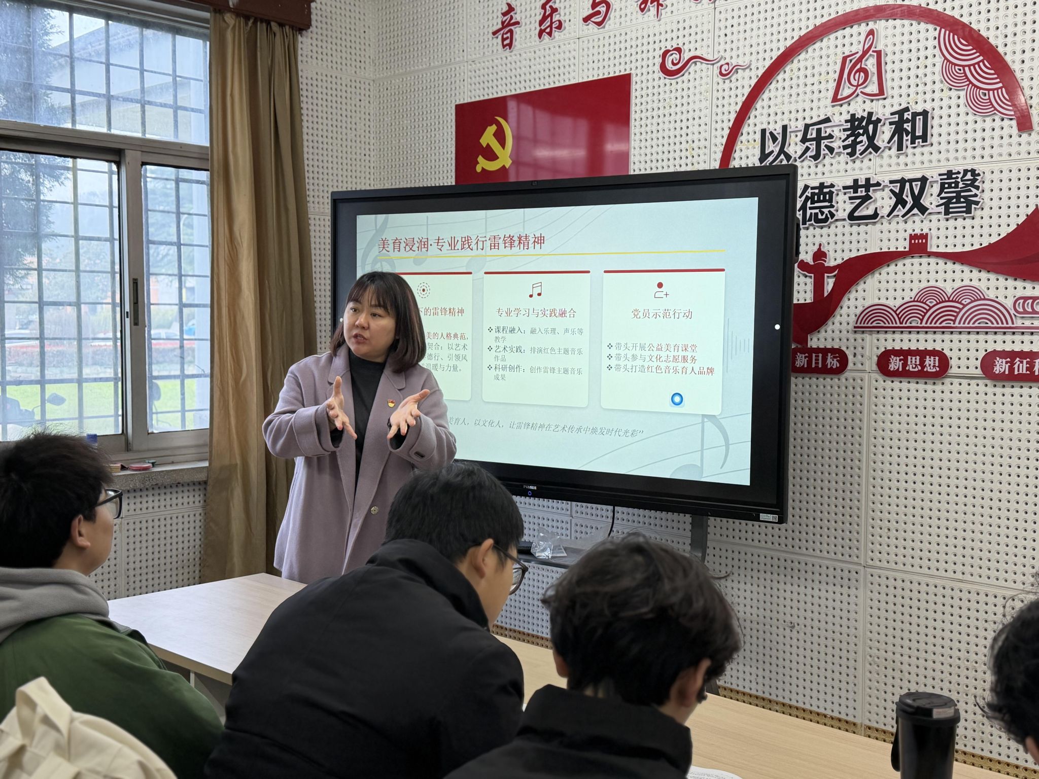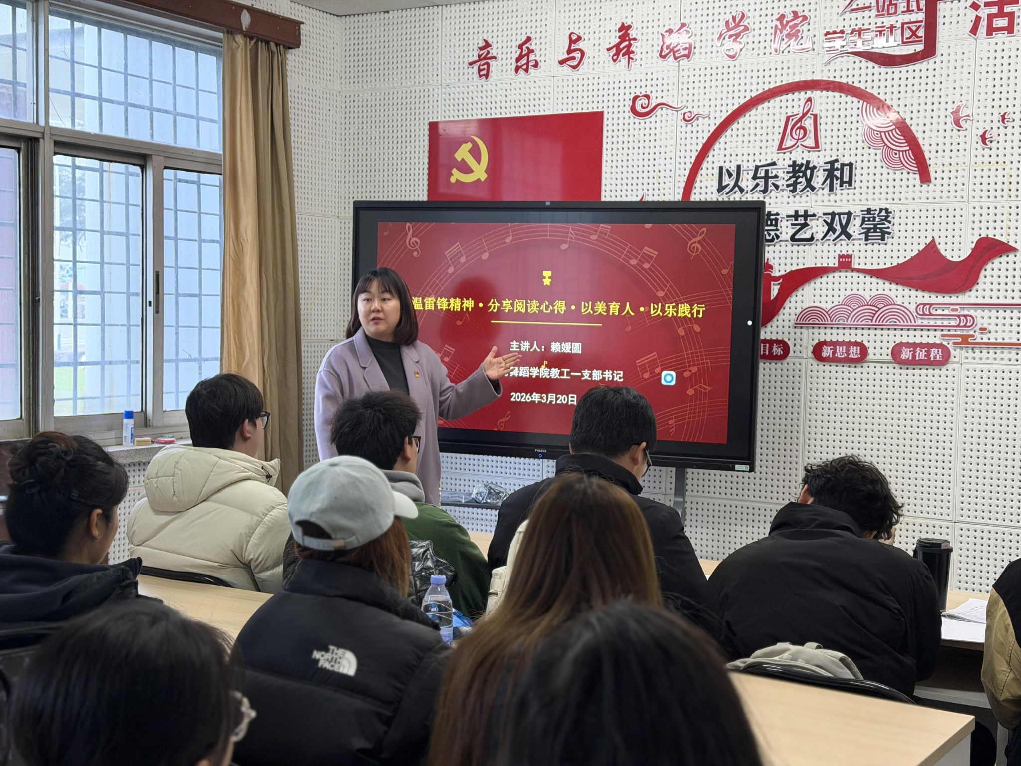 本次活动紧扣雷锋精神的时代内核,赖媛圆结合音乐专业特色,拆解出“敬业深耕、创新创作、服务群众”的践行方向,引导青年艺术学习者做好艺术领域的“螺丝钉”,以作品弘扬主旋律,以专业服务群众。师生共同研读《雷锋全集》《雷锋精神在当代》等经典著作,从文字中汲取精神养分,挖掘红色音乐创作与教学的灵感源泉。