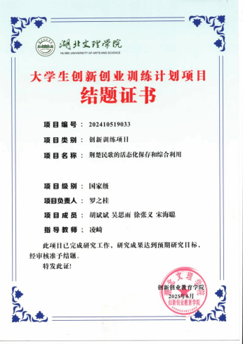 她认真负责,努力学习!坚信付出终会有收获,最终连续三年综测第一,2022年获得了襄阳市琵琶十重奏艺术展演金奖,2023年参加学院的合唱团,先后在校内和襄阳五中进行展演。大二下作为项目负责人跟随凌崎老师积极创新,和队员们反复打磨,最终我们的项目《荆楚民歌的活态化保存和综合利用》获国家立项。