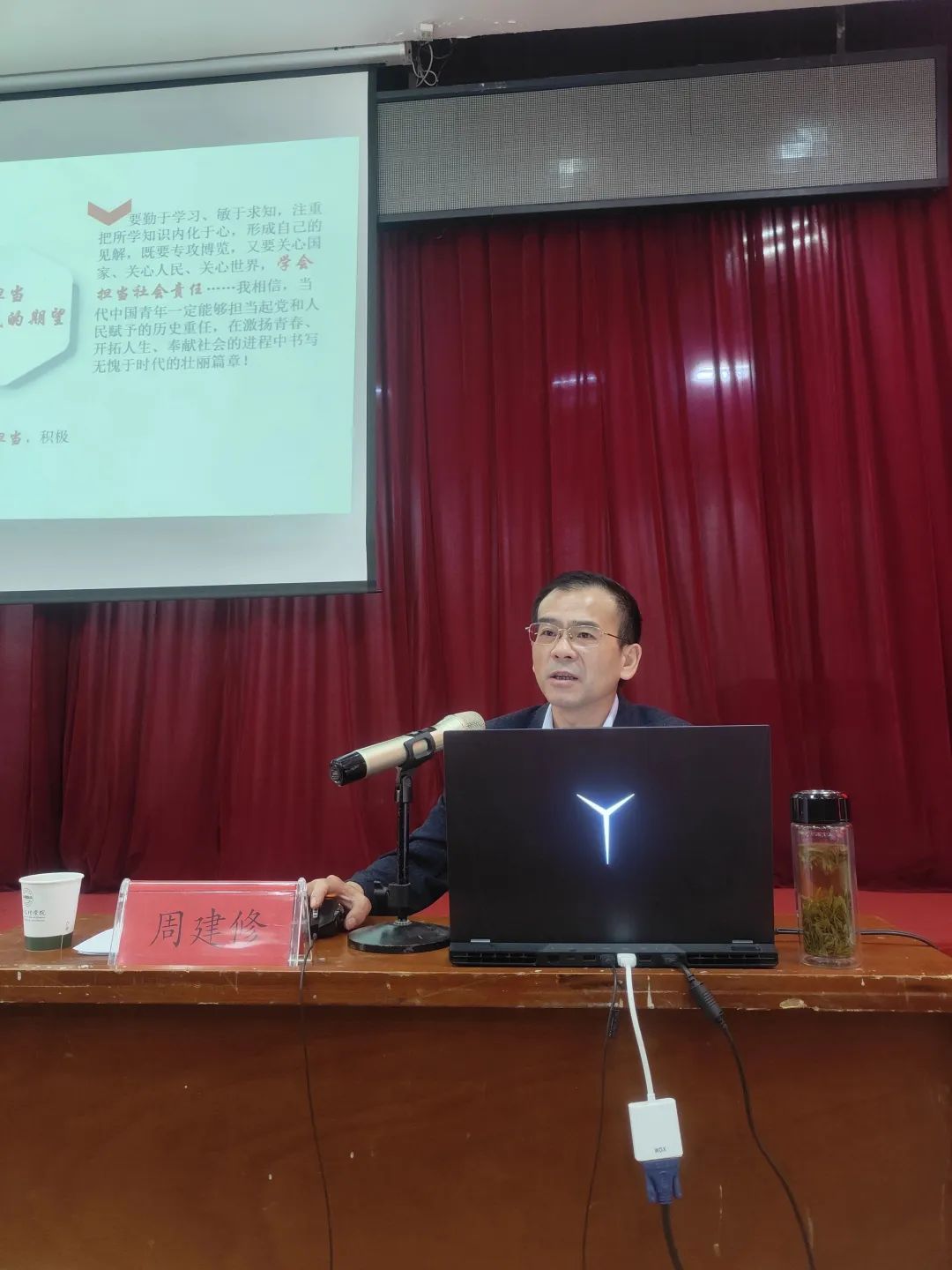 周建修就担当和担当精神、担当精神的时代内涵、担当精神的实践要求、担当精神的培育路径、对大学生的希望和要求等六方面为同学们展开讲解,引导同学们要立志做有理想、敢担当、能吃苦、肯奋斗的新时代好青年。在学校建设发展、实现中国梦的伟大奋斗中激扬青春梦想,书写无愧于历史、无愧于时代、无愧于未来的华彩篇章。