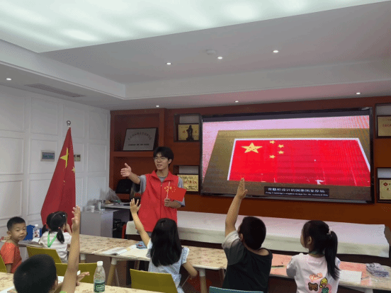 视频结束后,志愿者拿出精心准备的国旗、党旗、团旗图案,开始带领孩子们认识这些意义非凡的旗帜。“哪个小朋友知道党旗的标志像什么呀?”“像镰刀和锤子!” 一个小男孩高高举起手,抢着回答。志愿者微笑着点头:“没错!镰刀象征农民阶级,锤子象征工人阶级,它们共同组成了我们党旗的标志。”