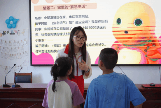 课堂上,志愿者们通过精彩的情景演绎,化身“骗子”和“机智小朋友”,还原了网络诈骗、陌生人诱骗等常见场景。生动的表演引得现场笑声不断,小朋友们在欢乐的氛围中,更深刻地理解了防诈骗知识。