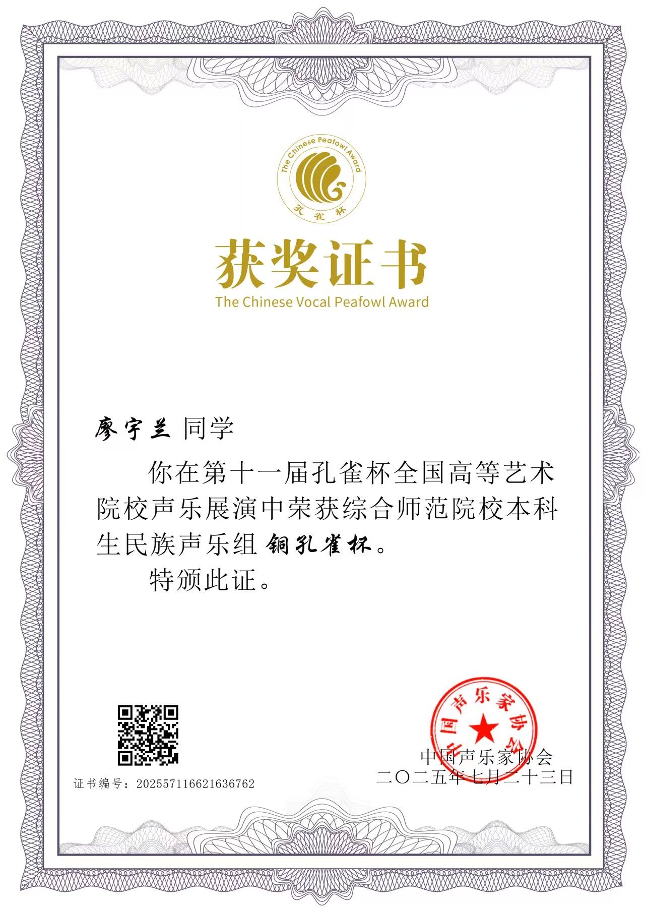在综合师范院校本科生民族声乐组的比拼中,音乐学 2112 班廖宇兰同学表现亮眼。她带来的展演曲目《绣荷包的俏妹子》韵味十足,总展演曲目《来生来世把你爱》情感饱满,最终荣获铜孔雀杯。这一成绩的取得,离不开指导老师王宏丽的悉心指导。