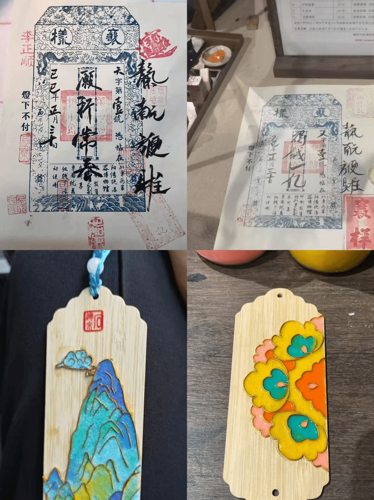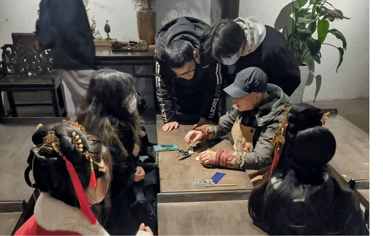在博物馆展厅,社员们了解了从漆树割漆到器物成型的完整流程。博物馆的老师现场演示了传统上漆技法,详细讲解 “黑髹”“朱漆”等工艺背后的文化寓意。随后,在非遗工坊区老师带领社员们进行掐丝珐琅和银票制作体验,经过两小时创作,十余件融合传统纹样与现代审美的掐丝珐琅书签、摆件雏形初现,过程中同学们相互交流、彼此学习,在实践中感受着非遗传承的责任与担当。