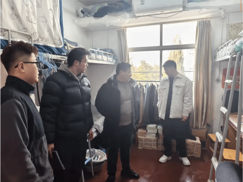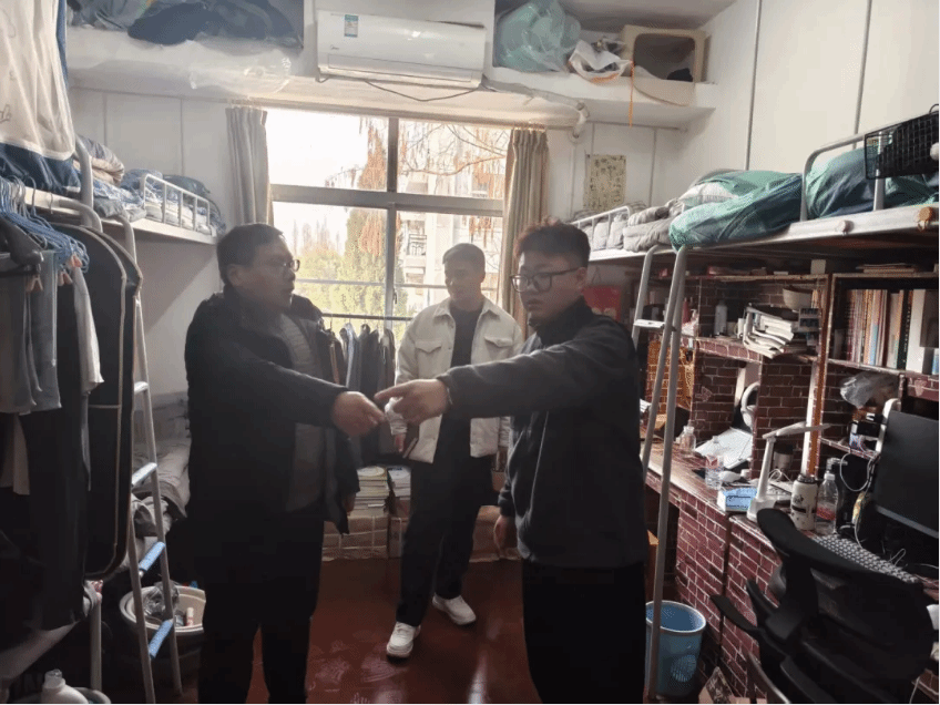 走访过程中,老师们与同学们亲切交谈,仔细询问同学们假期生活的点滴,认真倾听大家对新学期的规划与期待。姚朏朏副书记关切叮嘱同学们尽快调整作息,以饱满的精神状态投入到新学期的学习生活中。同时,他还着重强调了安全问题,包括用电安全、财产安全等,提醒同学们时刻保持警惕,营造安全舒适的寝室环境。