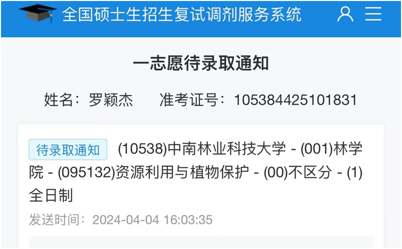 “关关难过关关过 前路漫漫亦灿灿”,终于,经过他脚踏实地的努力,在2024年4月被中南林业科技大学录取为研究生,他说:“我们披星戴月走过的每一步都算数,希望我们的努力最终都能赢来自己的春和景明。”